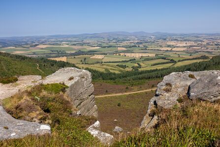 A sweeping view of the Rothbury Estate, from the Simonside Hills. A gap in a rock formation shows a vast area of field, out to the horizon and blue sky