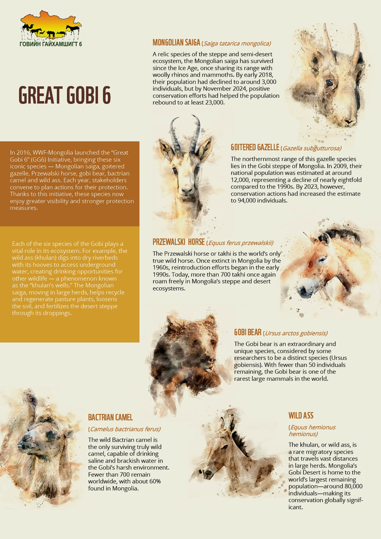 At the World Conservation Congress Mongolia has 140 mammals reflecting its continental location and habitat variability but of these, a ‘Big 6’ set of animals have been chosen as the icons for nature restoration efforts but also that they are keystone species that are endangered. Each of the six play a vital role in the Gobi Desert ecosystem. For example, the wild ass or kulan uses its sharp hooves to dig into dry riverbeds creating ‘kulan wells’ sustaining other life; the Mongolian saiga antelopes, moving in large herds, move nutrients around the steppe desert systems through their grazing and droppings.