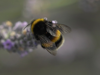 The garden bumblebee is a large, scruffy-looking bee, with a long tongue and face. It has yellow bands at the collar, rear of the thorax and at the first segment of the abdomen, and the tip of the tail is white. It is a relatively large a bumblebee and can be found in a variety of habitats from woodlands to gardens.