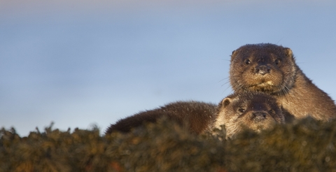 Otter (Lutra lutra) resting in sea weed, Isle of Mull, Scotland, UK - Danny Green/2020VISION