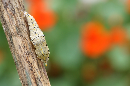 Pupae are often stuck to plant stems or hidden in leaf litter. One of the pupae you’re most likely to see is that of the large white. They can sometimes be found on the outer walls of houses, if you have a garden with plenty of food for the caterpillars. They’re wonderfully angular, alien-looking structures covered in spots and speckles.