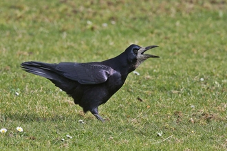 The carrion crow is all-black, with a glossy sheen. Unlike the rook, it has a black bill with no bare patches, and does not sport any feathery 'trousers' on its legs. Crows are also usually found singly or in small numbers, whereas rooks tend to hang out in large groups. The crow is smaller than the raven and has a square-ended tail, compared to the raven's diamond-shaped tail.
