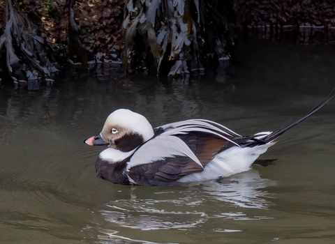 Long-tailed ducks look very different throughout the year. Adult males can always be recognised by their incredibly long, black tail. In autumn, males are largely white, with grey and black on the body and wings. They have a mostly white head, with a dark smudge on the cheek, and a dark beak with a pink band across it. Over winter they develop more patterning on the face, with a grey-brown patch surrounding the eye. In summer, the breast and face become black, but they still have a grey-brown patch around the eye. They also develop rich brown feathers on the back.