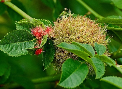 Living up to its name, the Robin's pincushion is a red, round, hairy growth that can be seen on wild roses. It is caused by the larvae of a tiny gall wasp that feeds on the host plant, but causes little damage.