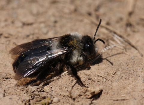 The ashy mining bee is a solitary bee, which means that female bees live alone, each creating their own nest. Ashy mining bees usually emerge in March and can be seen until June, though are occasionally seen later in the year. They can be found in a wide range of open, sunny places, from coastal grassland, moorlands and riverbanks to quarries, parks and gardens. They collect nectar and pollen from spring flowering trees and shrubs like willow and blackthorn, as well as flowers such as dandelions and buttercups.Each female digs a nesting burrow in a patch of bare or almost bare earth, such as on a well-trodden footpath, a patchy lawn, or a heavily-grazed field. Their burrows are around 10-20cm deep. Sometimes many females will nest close together. Look out for a little heap of soil piled around the burrow entrance, like a miniature volcano. Once a female has dug a nest chamber, she adds some pollen to it, often moistened with nectar, and lays an egg next to it. She then seals off this chamber and moves on to the next. When each egg hatches, the larva will fatten up on the pollen and nectar, ready to pupate and emerge as an adult the following spring.