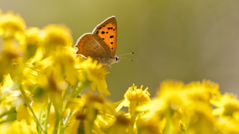 The small copper lives up to its name in both colour and size! Look out for it from April onwards in dry, sunny habitats like heathland, downland and woodland. It can be spotted in gardens, too.