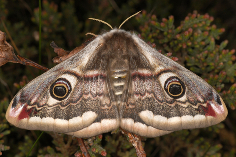 An unmistakeable insect of heaths, sand dunes and grasslands, the Emperor moth is fluffy, grey-brown, with big peacock-like eyespots on all four wings. Males can be seen during the day, but females lie low.