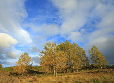Aspen is a slender poplar tree that can be spotted on heathland and in woodlands, particularly in Scotland. It displays hanging catkins in spring and its fluttering leaves turn vibrant yellow in autumn.