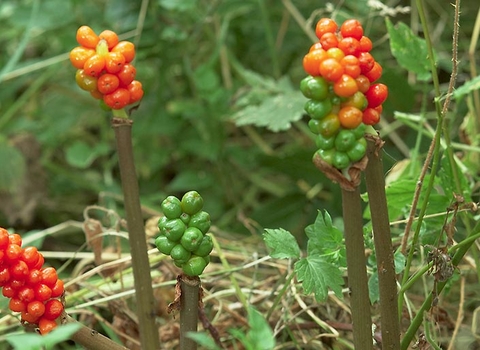 An early flowering plant, lords-and-ladies can be seen in April and May. It is a shade-loving plant of woodlands and hedgerows, and is particularly distinctive as it displays a pale green sheath surrounding a purple or yellow 'spadix' (a spike of tiny flowers on a fleshy stem). This spadix eventually produces an upright stalk of bright red berries that is conspicuous among the leaf litter.How to identify