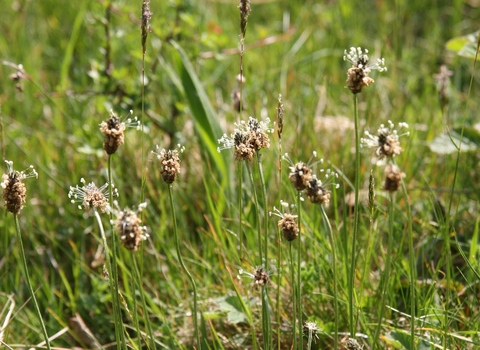 The brown, oval flower heads of ribwort plantain balance on top of thin, wiry stems; the resulting seed heads provide food for birds in winter. Look for this 'weed' in lawns, fields and grasslands.